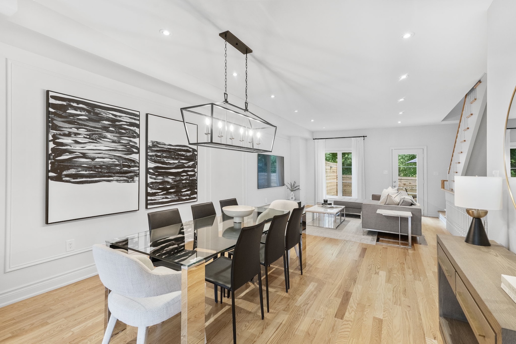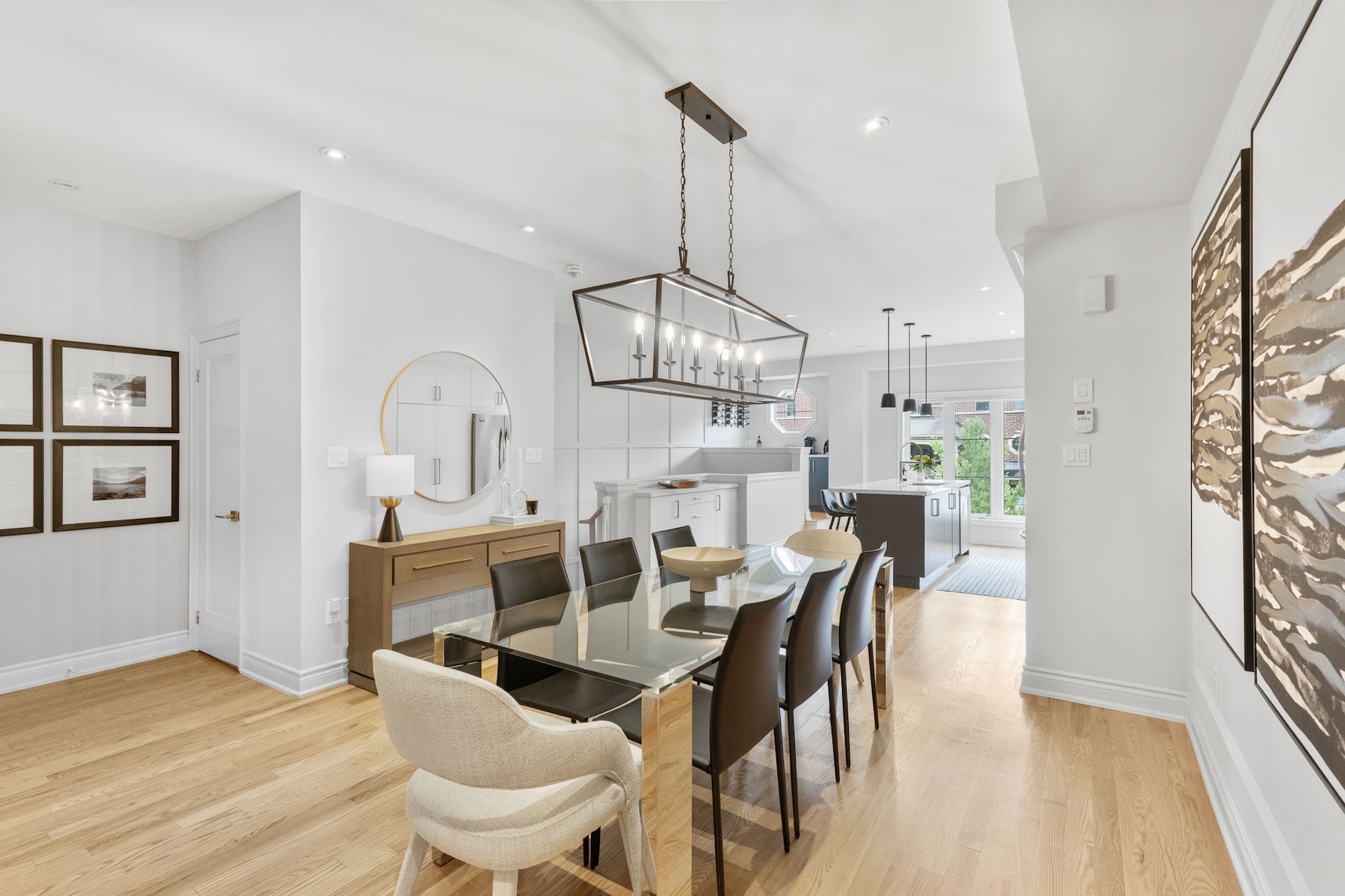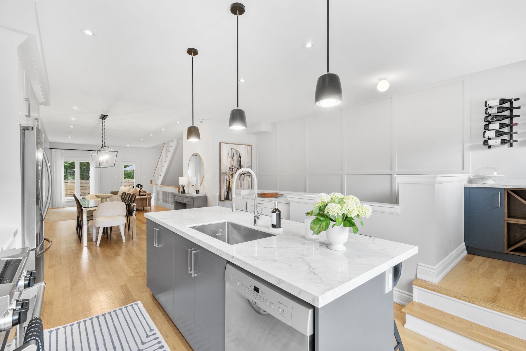 The main floor boasts a bright, open-concept layout where the kitchen, dining, and living areas flow seamlessly together ideal for both entertaining and everyday life. The renovated kitchen features sleek finishes, ample storage, and a dedicated coffee/bar area that adds both style and function. A tucked-away powder room enhances the convenience and smart design of this level.