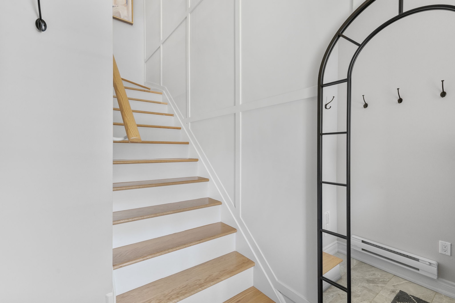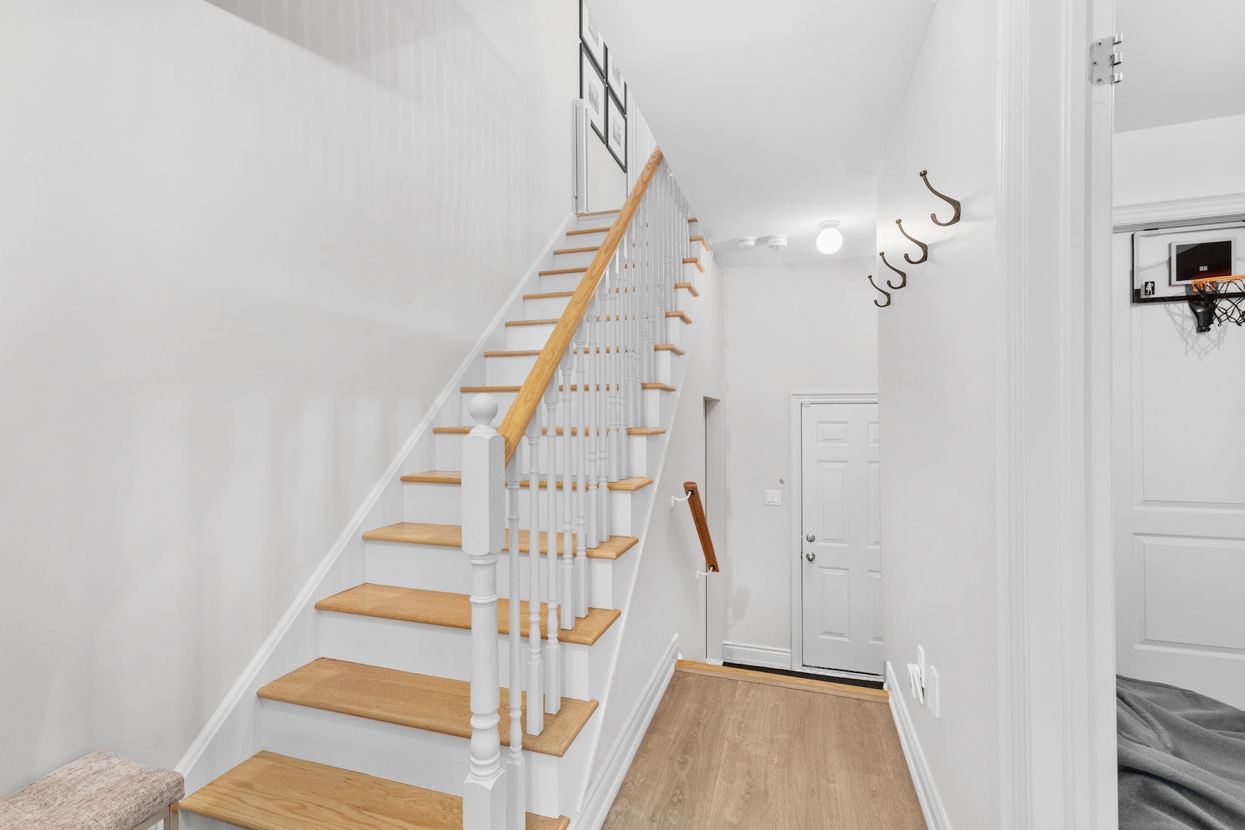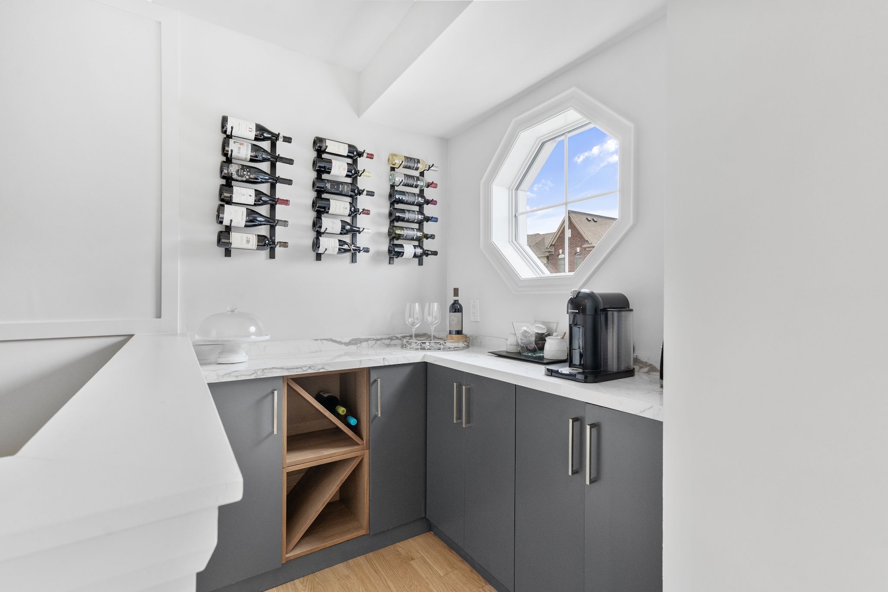 The main floor boasts a bright, open-concept layout where the kitchen, dining, and living areas flow seamlessly together ideal for both entertaining and everyday life. The renovated kitchen features sleek finishes, ample storage, and a dedicated coffee/bar area that adds both style and function. A tucked-away powder room enhances the convenience and smart design of this level.